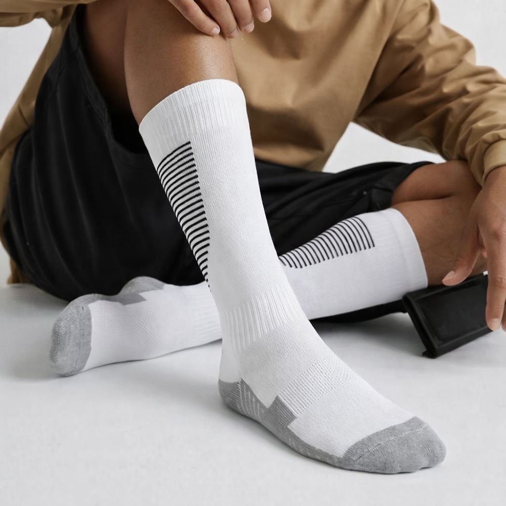 스포츠에 최적화된 핏 스포츠 축구 양말 SPORTS FOOTBALL SOCKS 초밀착 | 통기성 | 편안한 착용감 | 충격흡수 적당한 압박감과 쿠션감으로 축구화 착용 시에도 밀림 없이 안정적이며, 경기·훈련·러닝 등 다양한 스포츠 활동에 적합합니다. 권장 발 사이즈: 240~270mm Detail 최상단 (밴드): 탄탄한 밴드로 흘러내림 방지 중간 (종아리 압박): 부위별 단계적 압박, 다리 피로 감소 측면 (탄성/밀착): 반복 세탁에도 유지되는 뛰어난 밀착감 발등 (메쉬): 발등 통기 메쉬로 쾌적함 유지 최하단 (쿠션/충격): 바닥면 고밀도 쿠션으로 충격 흡수 |