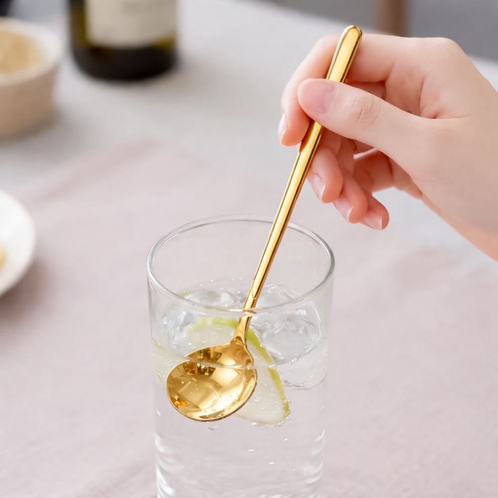 홈 카페 음료부터 디저트까지 하나로 길어서 더 편리한 롱 티스푼 짧은 티스푼, 바닥까지 닿지도 않고 손에 묻을까 조심스럽고.. 퐁당 빠져버려 답답하셨죠? 이 모든 스트레스, 날려버리세요. 15cm 여유, 길이가 다르면 사용감이 달라집니다. 깊은 잔과 긴 컵에 더 알맞은 길이로 음료를 섞거나 디저트를 즐길 때 더욱 편리합니다. ㅁ 아이스 라테처럼 긴 컵 음료를 자주 마시는 분 ㅁ 에이드처럼 과일이나 토핑을 으깨거나 섞어야 하는 분 ㅁ 파르페, 아이스크림 등 컵 디저트를 즐기는 분 ㅁ 깊은 텀블러에 담긴 음료를 저을 때 ▶ 깊은 컵에도 편리하게 긴 컵에 알맞은 여유 있는 길이로 음료부터 디저트까지 편하게 - 음료를 쉽게 저어요 - 디저트도 쉽게 떠먹어요 ▶ 매일 입에 닿는 거니까, 소재와 마감까지 세심하게 01. 위생적인 304 스테인리스 물기와 오염에 강하고 고품질 스테인리스 소재로 녹 걱정 없이 안심하고 사용할 수 있습니다 02. 얼굴이 비칠 듯 선명한 미러 폴리싱 거친 면 없이 매끈하게 마감된 표면이 고급스러운 광택과 부드러운 사용감을 더해줍니다. ▶ 매일 쓰기 좋은 롱 티스푼 "홈 카페의 완성, 화려하고 우아한 골드" 티타늄 코팅으로 색 변함을 최소화하여 오래도록 변치 않는 아름다움을 선사합니다. |